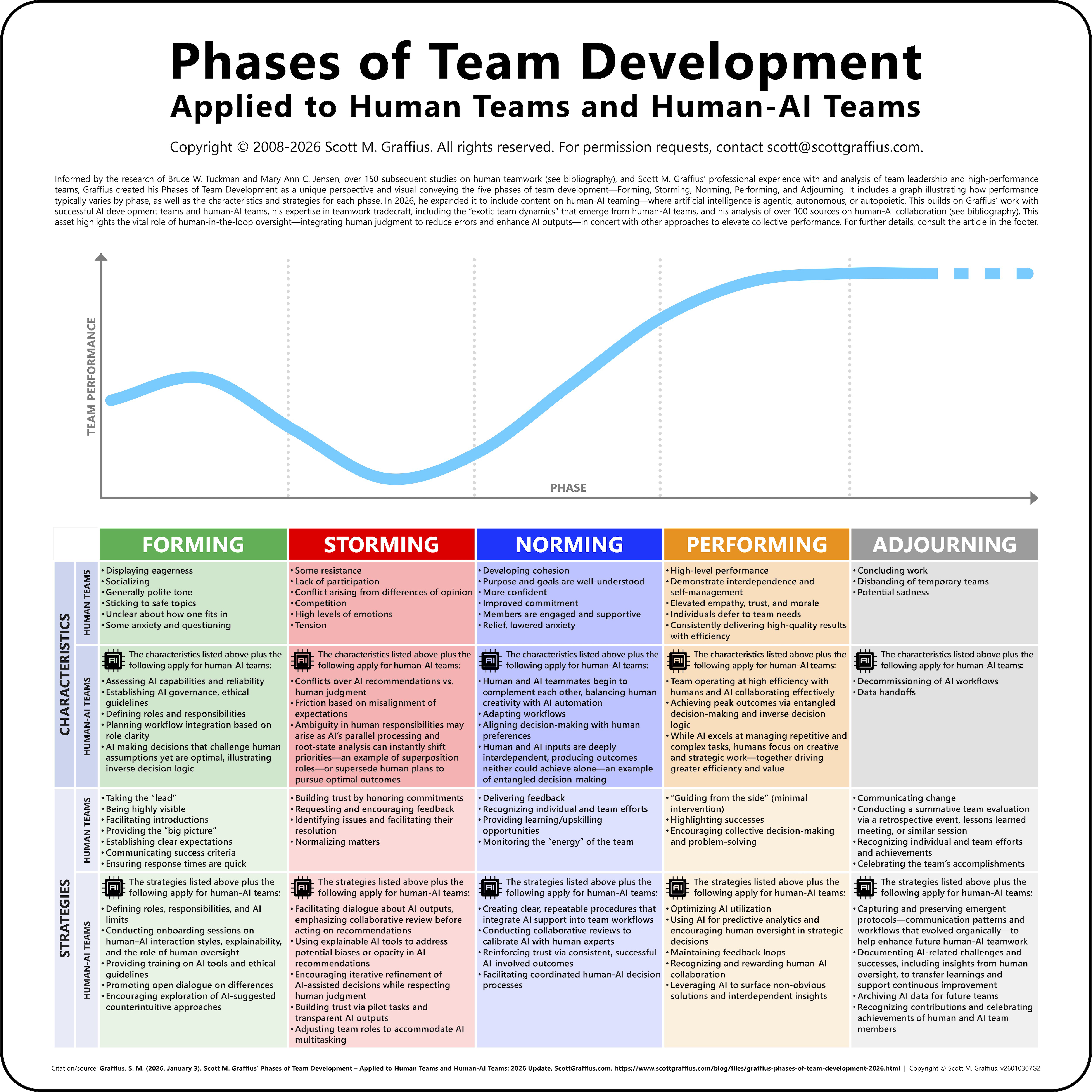 Informed by the research of Bruce W. Tuckman and Mary Ann C. Jensen, over 150 subsequent studies on human teamwork, and Scott M. Graffius' first-hand professional experience with and analysis of team leadership and high-performance teams, Graffius created his "Phases of Team Development" as a unique perspective and visual conveying the five phases of team development—Forming, Storming, Norming, Performing, and Adjourning—inclusive of a graph showing how performance varies by phase, as well as the characteristics and strategies for each phase. Project Managers, Scrum Masters, Agile Coaches, and other leaders can apply these insights to overcome team challenges, fostering happiness, productivity, and success in both human and human-AI teams. Graffius initially developed his unique material in 2008, and he periodically updates it. This article introduces the 2026 edition of his work.