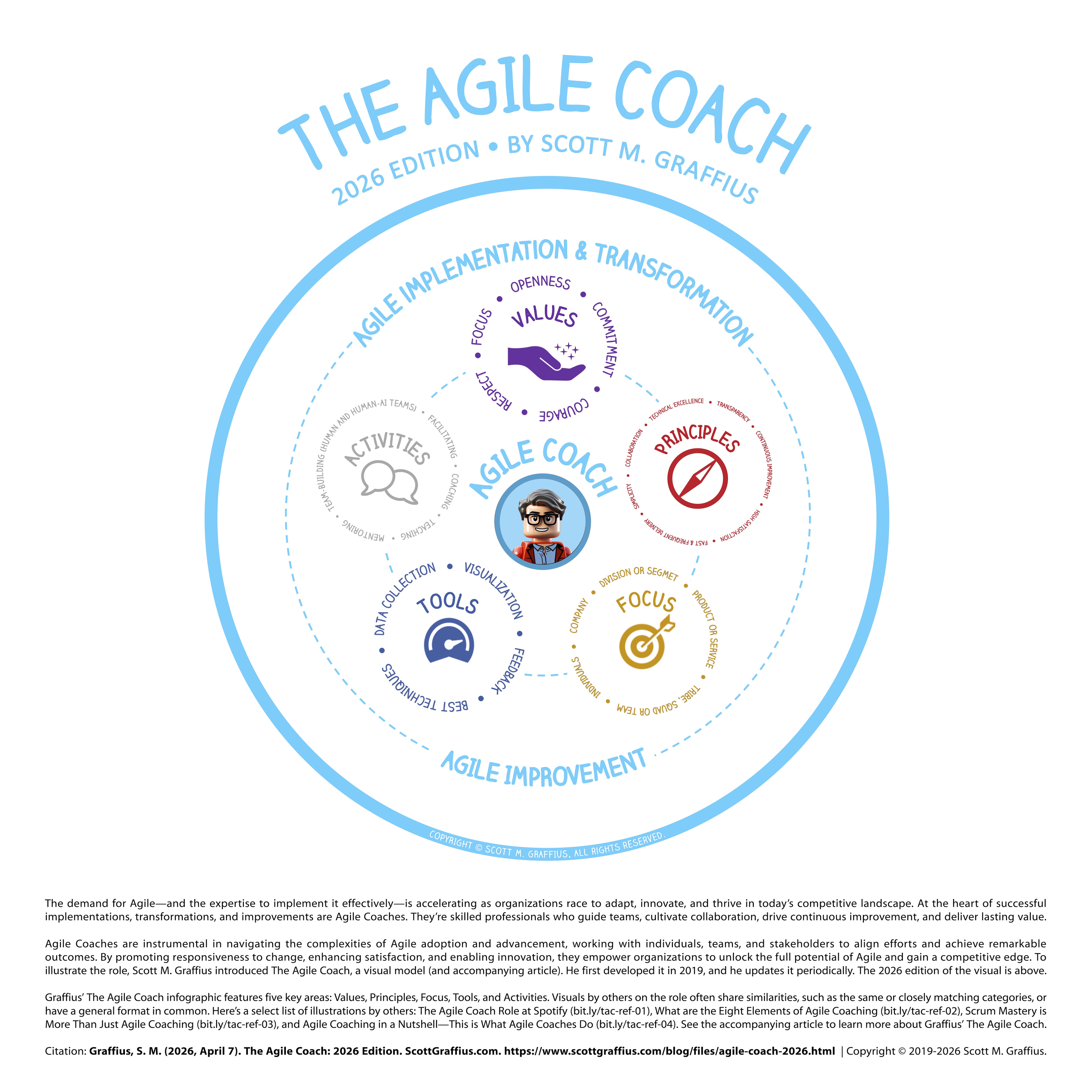 To encapsulate the full breadth and depth of the role, Scott M. Graffius created "The Agile Coach"—a visual model first introduced in 2019 and regularly updated. The 2026 edition appears at the top of this article. It distills the values, guiding principles, focus areas, tools, and activities that define high-impact Agile coaching today.
