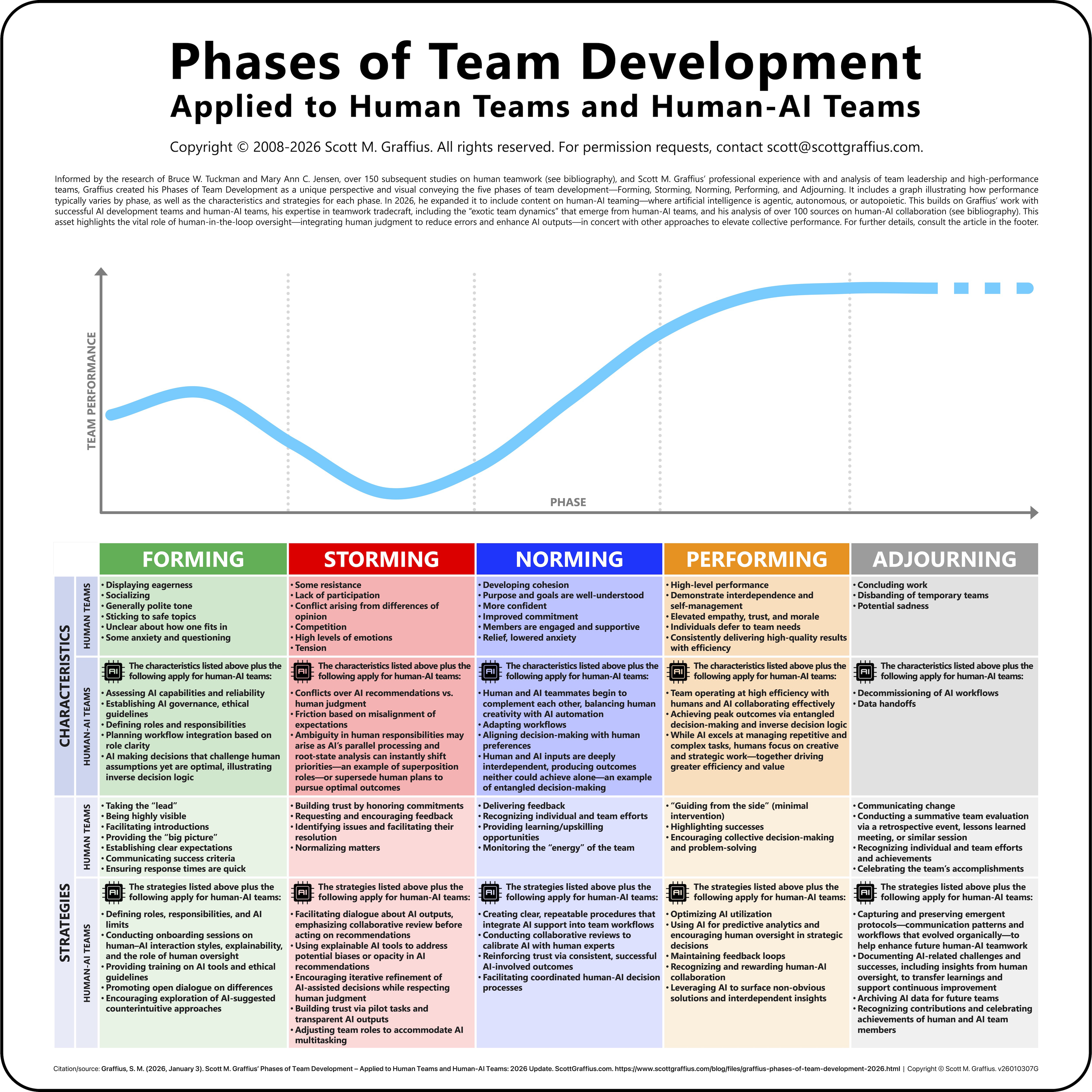 Informed by the research of Bruce W. Tuckman and Mary Ann C. Jensen, over 150 subsequent studies on human teamwork, and Scott M. Graffius' first-hand professional experience with and analysis of team leadership and high-performance teams, Graffius created his "Phases of Team Development" as a unique perspective and visual conveying the five phases of team development—Forming, Storming, Norming, Performing, and Adjourning—inclusive of a graph showing how performance varies by phase, as well as the characteristics and strategies for each phase. Project Managers, Scrum Masters, Agile Coaches, and other leaders can apply these insights to overcome team challenges, fostering happiness, productivity, and success in both human and human-AI teams. Graffius initially developed his unique material in 2008, and he periodically updates it. This article introduces the 2026 edition of his work.